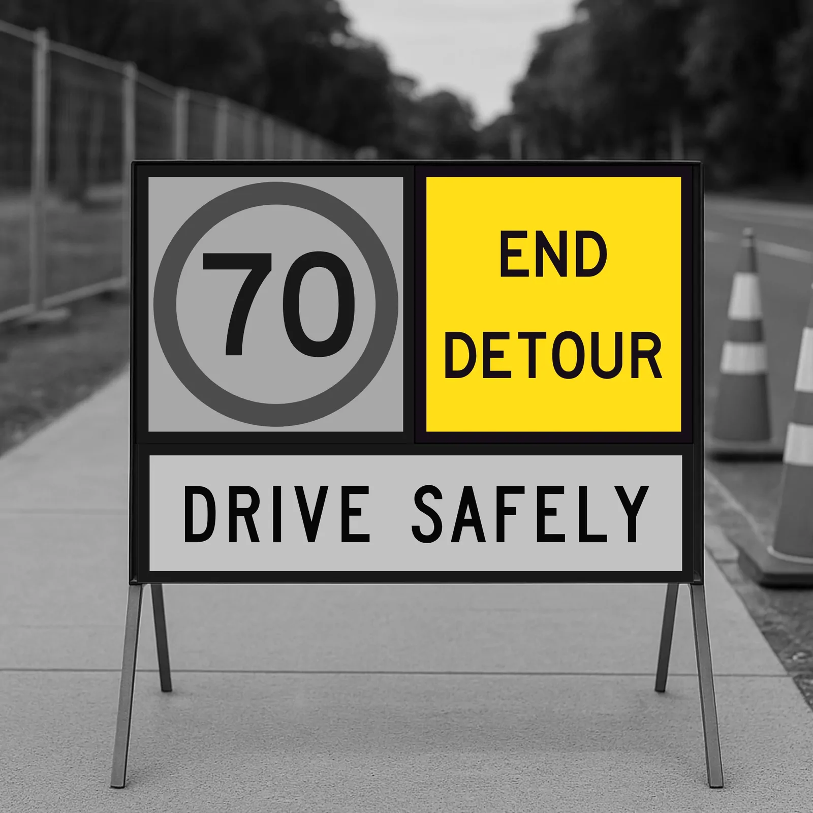 In a Multi-Message Sign Frame No. 1, this sign is commonly paired as part of the full detour sequence, for example with Detour Ahead and a 1200x300 detour arrow panel at the start of the diversion, and then this End Detour panel placed at the exit point. Where required, it can also be paired with a Drive Safely or Do Not Overtake 1200x300 panel to reinforce safe behaviour as drivers transition back to normal flow.