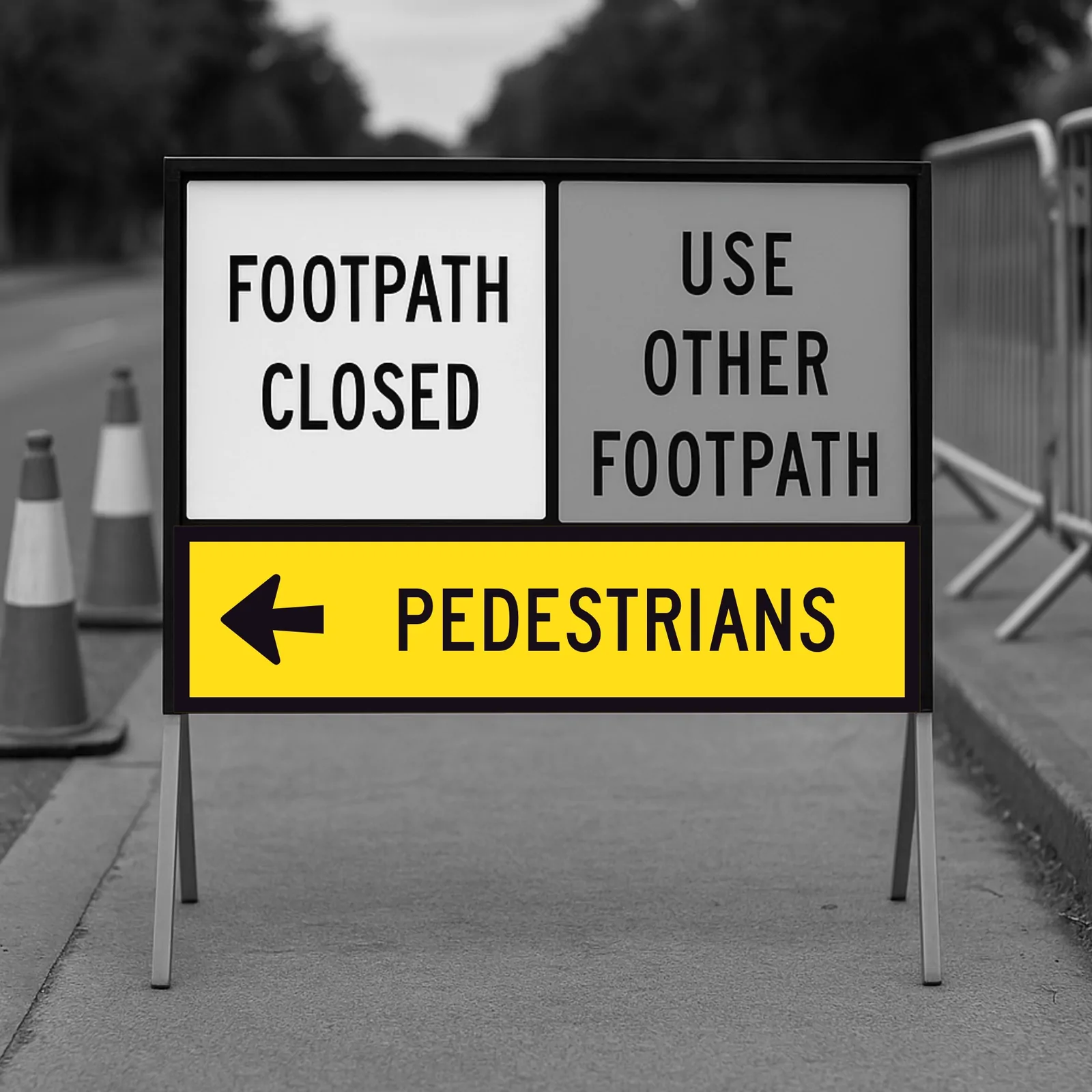 Pedestrians Left (1200x300x6mm) Corflute Sign: Hi-vis temporary traffic sign for Multi-Message Frame. Made in Aus to VicRoads Spec 86 & AS 1742/1743. Retroreflective yellow background, black legend. Full-cube reflective sheet for top brightness & safetyAvailability Description