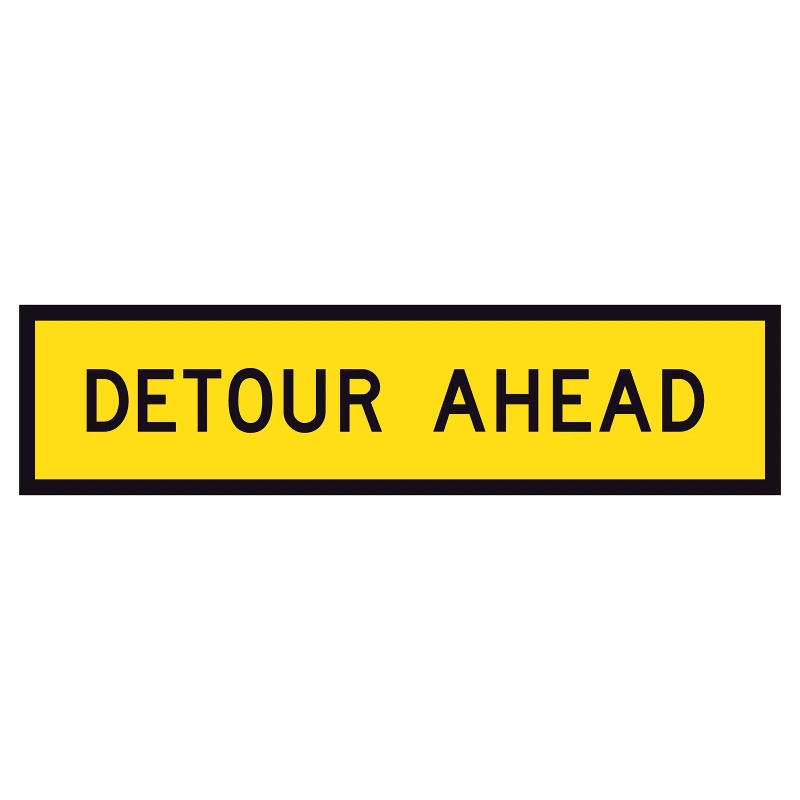 - Clear black "DETOUR AHEAD" legend on retroreflective yellow background