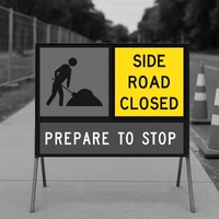 TM1-32A/TM2-43A Side Road Closed (600x600) Corflute Sign: Hi-vis temporary traffic sign for Multi-Message Frame. Made in Aus to VicRoads Spec 86 & AS 1742/1743. Retro yellow background, black legend. Full-cube reflective sheet for top brightness.Availability Description