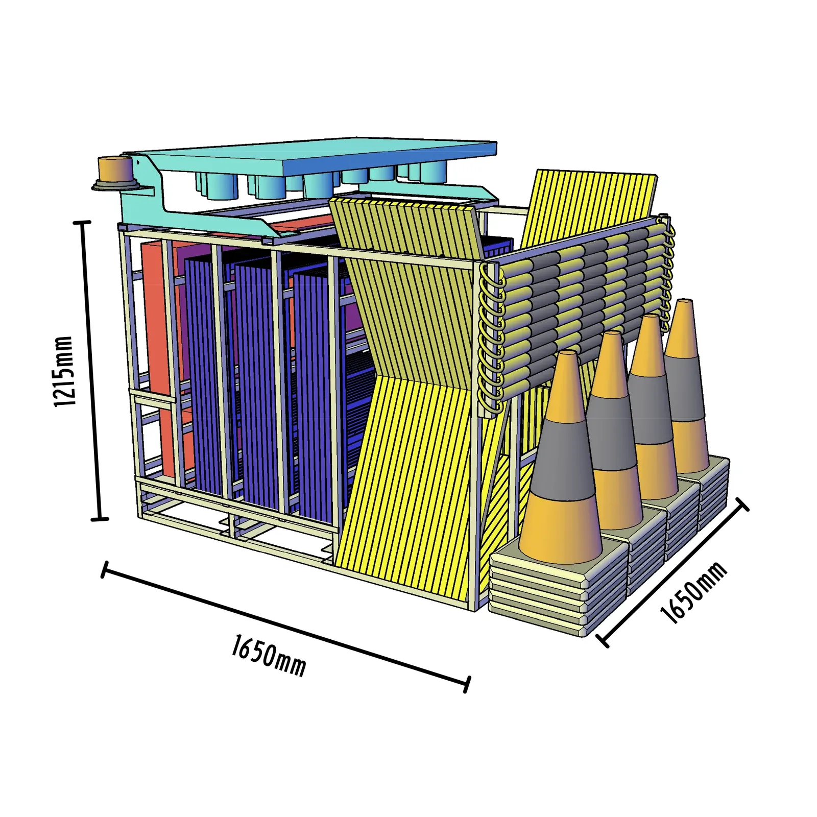 - Secure Storage: Safely organises multi-message frames, signs, arrowboards, bollards, cones, and stop/slow bats.