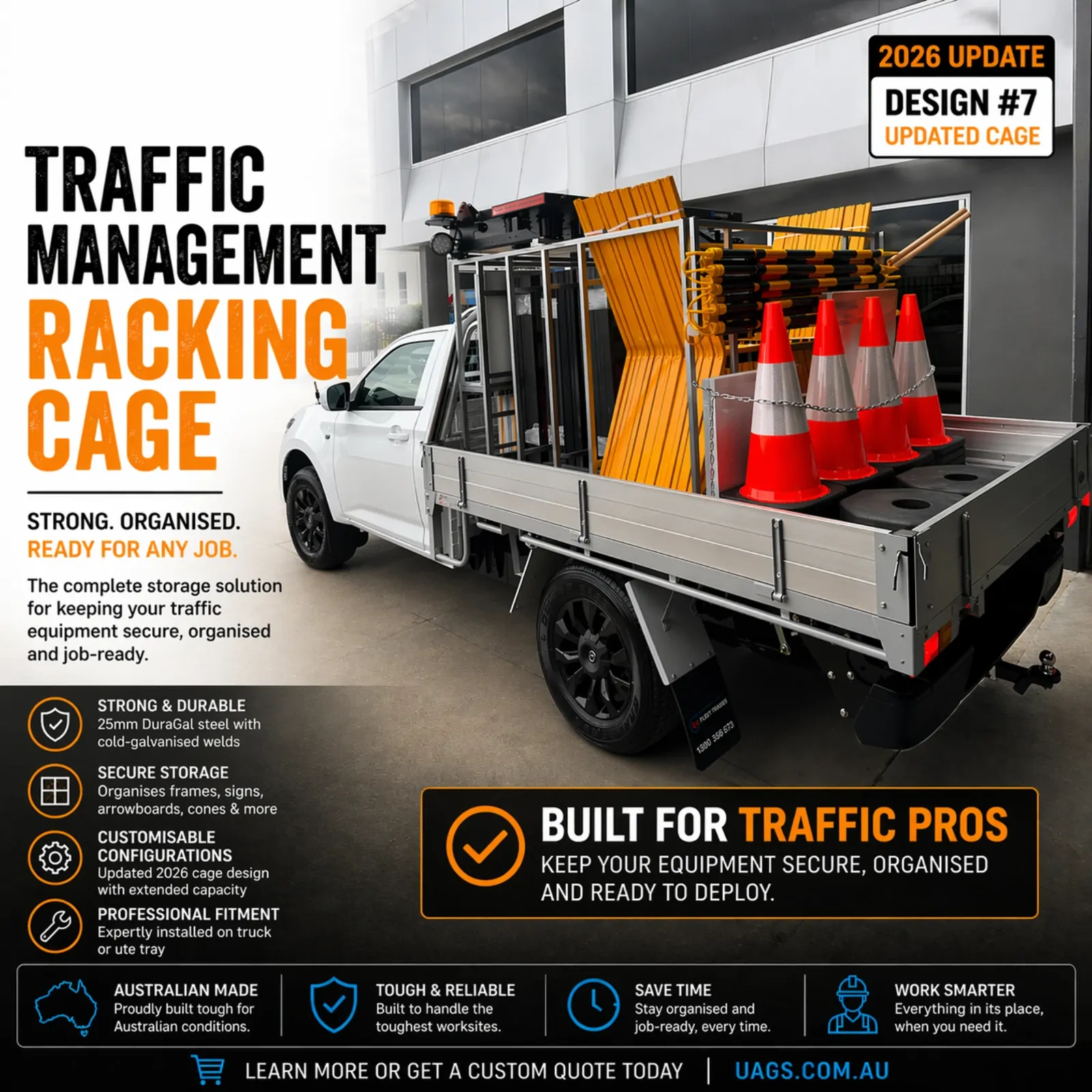 The Traffic Vehicle Racking Cage from UAG Services is a durable, Australian-made storage solution for traffic management equipment. Constructed from 25mm duragal steel, it securely organises signs, arrowboards, bollards, and cones on trucks or utes.Availability Description
