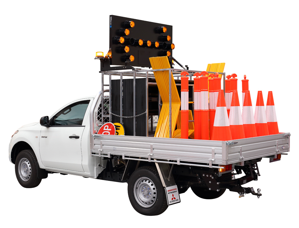 - Complete Fitout Option: Includes cage, multi-message frames, B-Class arrowboard, LED beacons, Y-frame legs, T-top bollards/cones, stop/slow bats, and traffic wands (products sold separately).