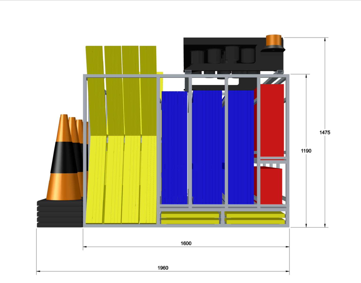 - Secure Storage: Safely organises multi-message frames, signs, arrowboards, bollards, cones, and stop/slow bats.