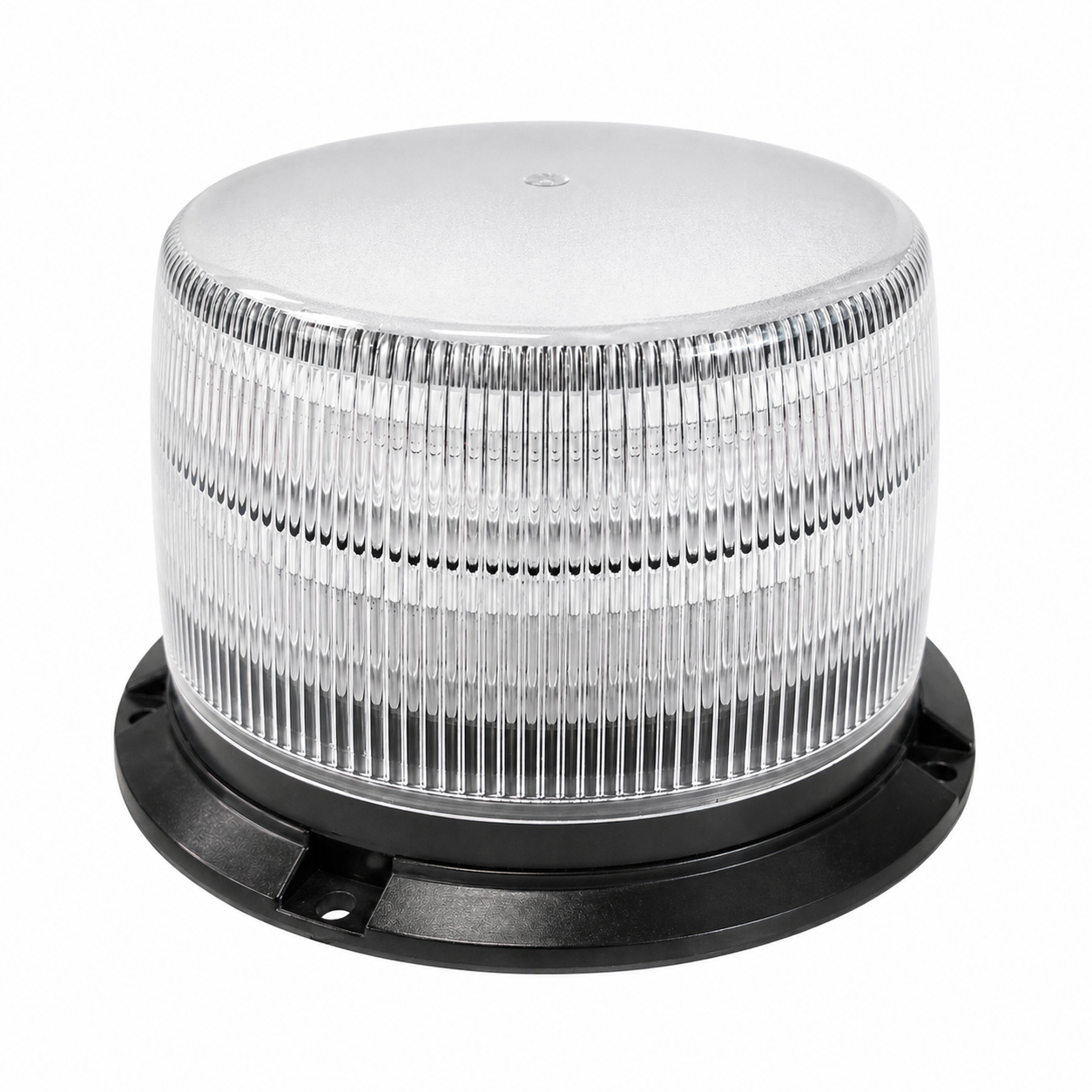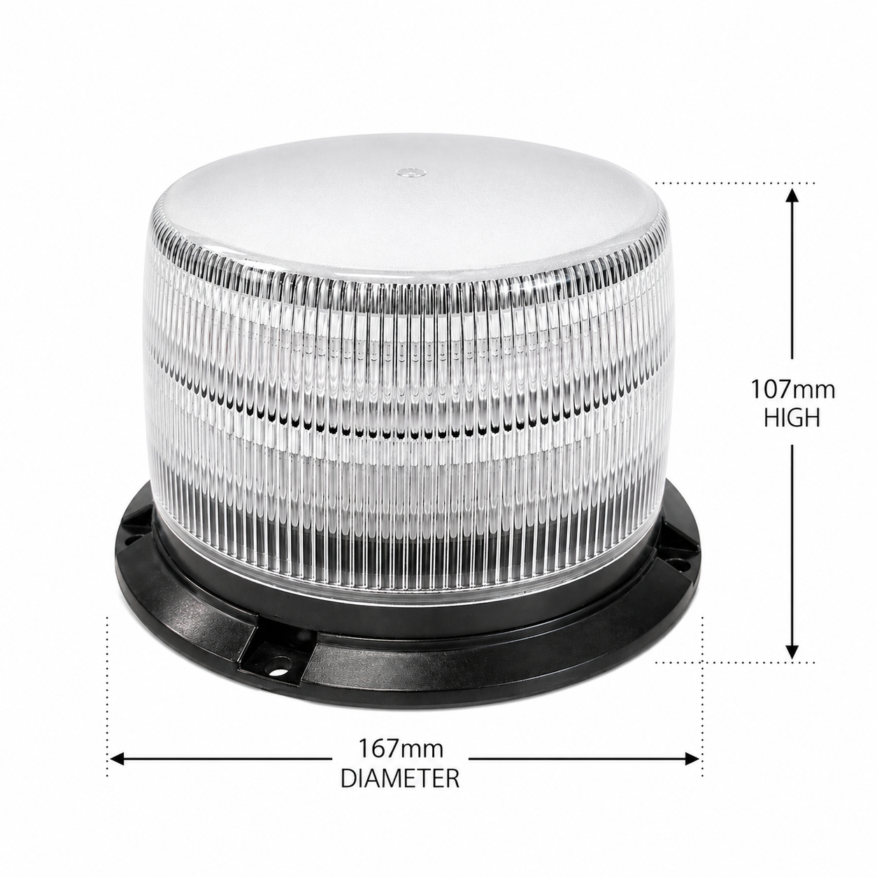 Constructed for exposed vehicle environments, the unit is rated to IP65 and operates across 12V to 48V DC systems. The housing supports continuous use in vibration, dust and weather exposure, with an operating temperature range of -30°C to +50°C and storage range down to -40°C. Maximum current draw is 3.24A at 12.8V. This clear lens version is suited to installations where amber warning output is required with a more neutral outer lens appearance. For the same beacon with an amber outer lens, use the U42-24AAT 48W Amber LED Flashing Beacon.