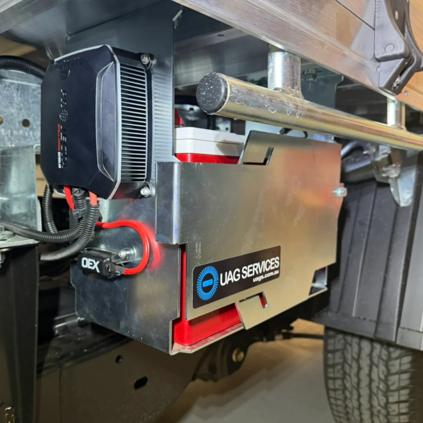 A second battery in this location is ideal for running traffic control equipment, arrow boards, VMS signs, work lights, inverters, fridges and other power draining accessories without compromising the starting battery. For engine bay mounting, you would need heat shielding, ventilation and high temperature batteries just to approach the same life you get from a cooler under tray installation.